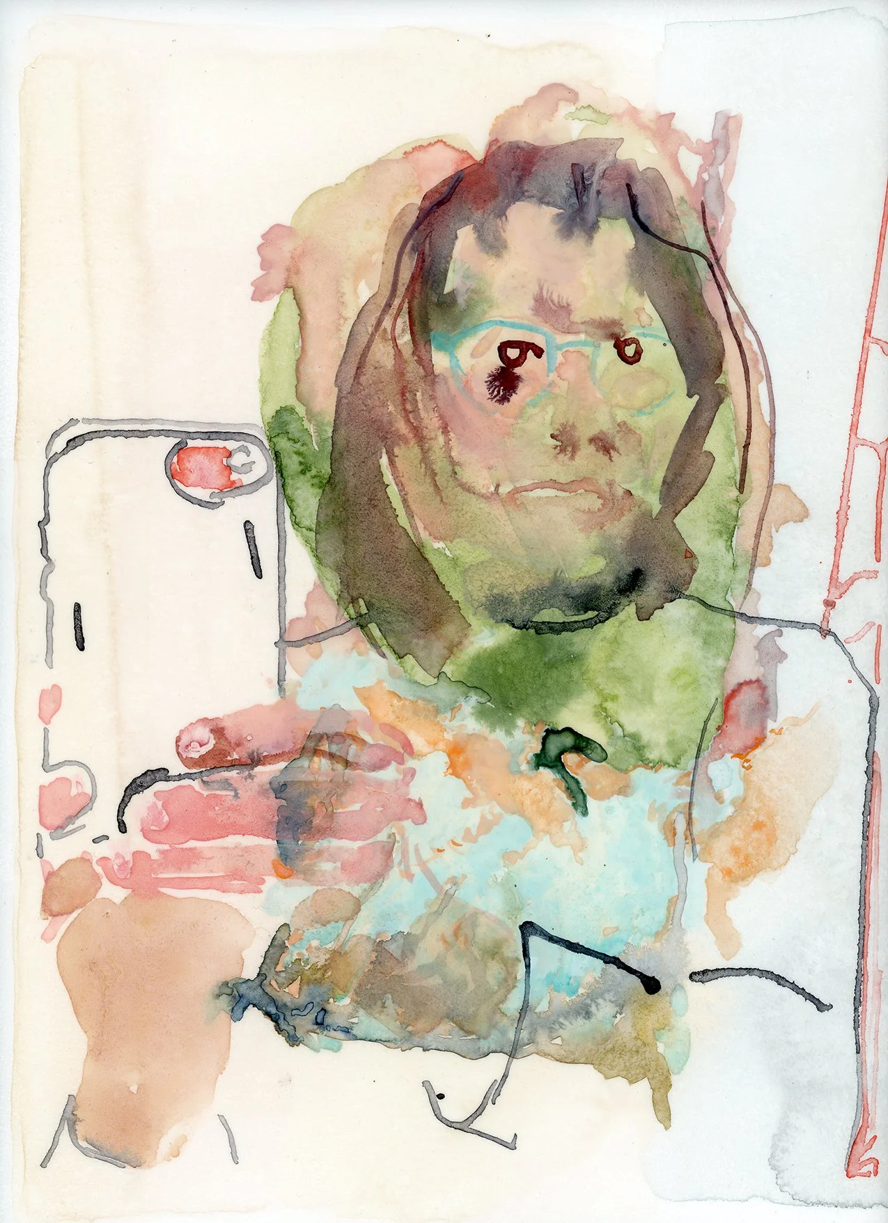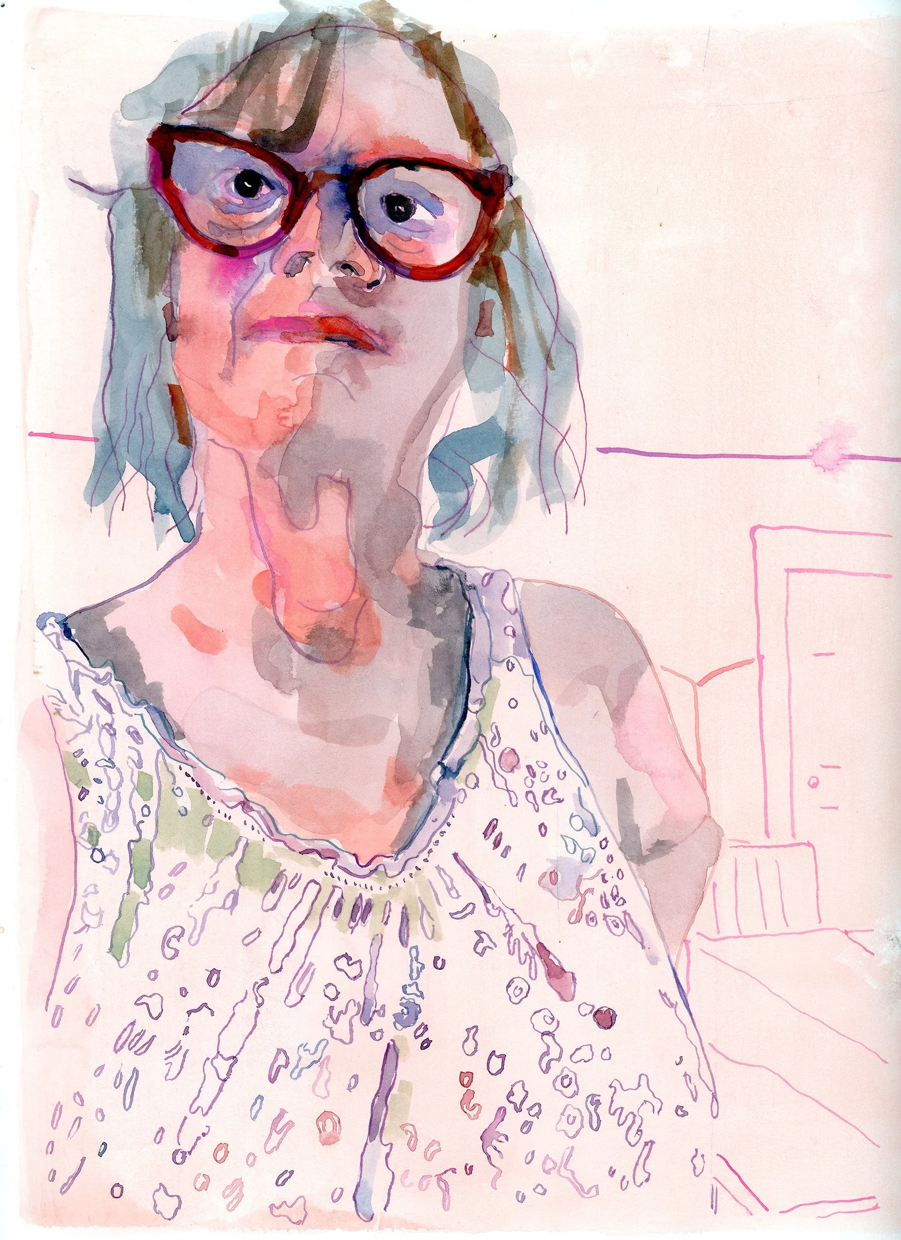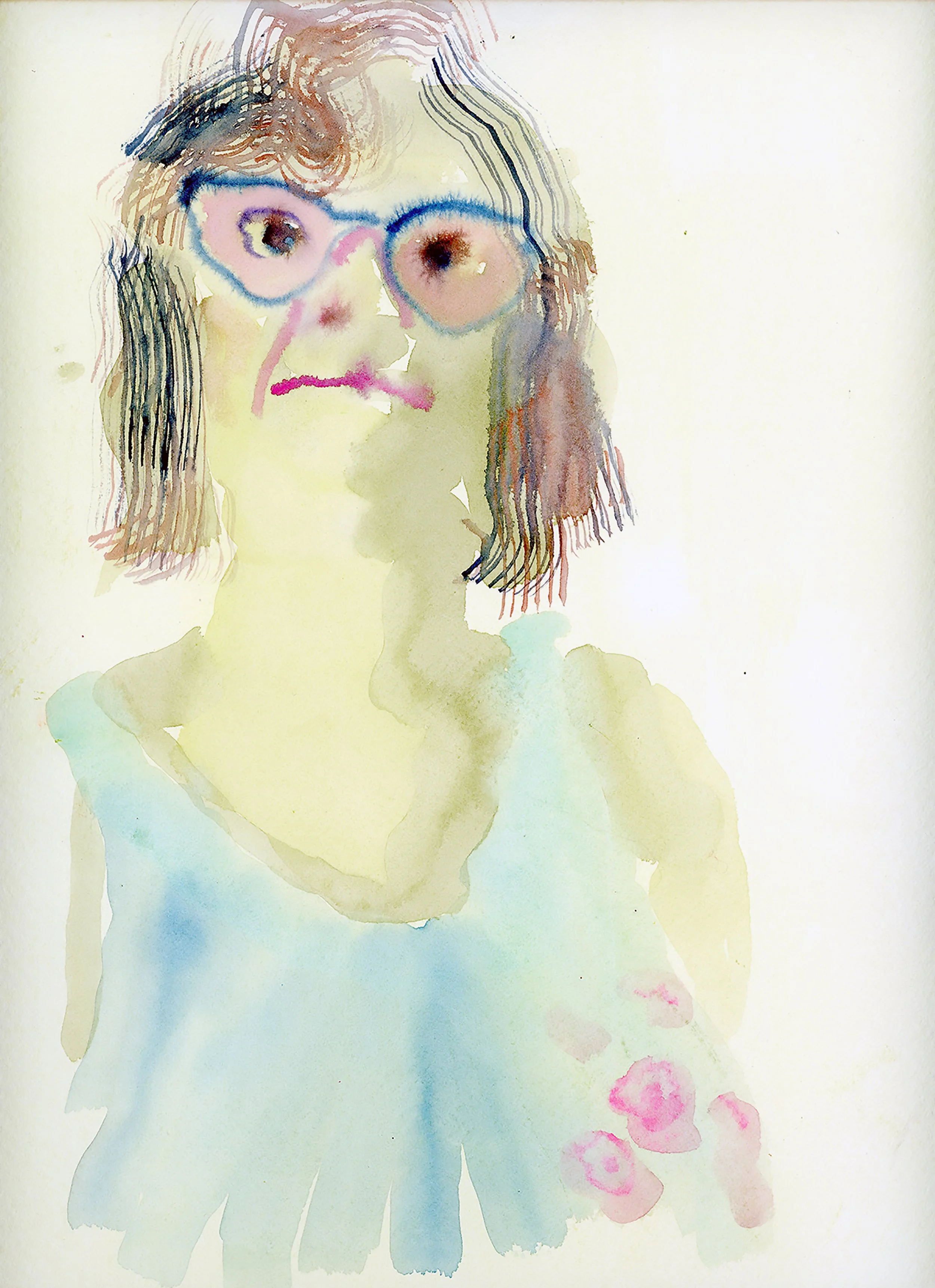 Wilson maintains a daily practice of completing a sketchbook size painting a day—more recently in watercolor, and previously with oil paint on Dura-lar. These portraits come from figures in her life, or the news, and are some of her reflections on the current moment including: political deception, corporate rage, gender identity at play, aging. She says she paints in order to understand.
